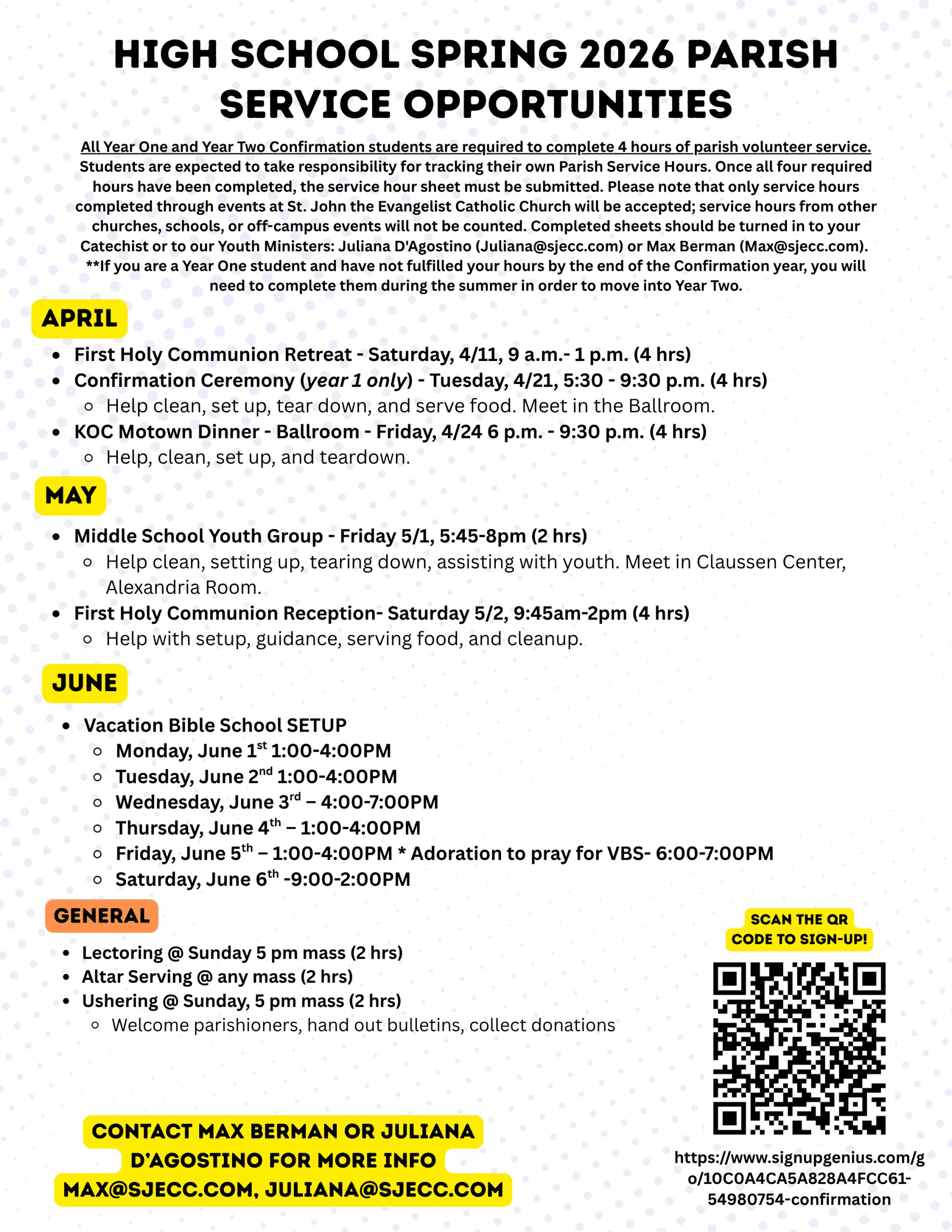Please email Juliana D’Agostino at Juliana@sjecc.com or Max Berman at Max@sjecc.com if your student is interested in volunteering at one of the following events/programs.